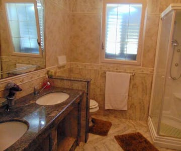 The furnishings are a blend of modern and traditional styles. The accommodation features a spacious private bathroom with double sink and hydromassage shower.